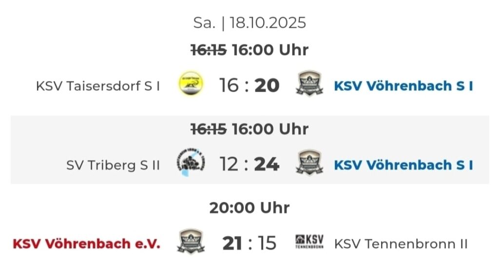 Heimsieg gegen KSV Tennenbronn II – Schüler SI gewinnen beide Kämpfe auswärts. Beitrags-Autor:KSV Beitrag veröffentlicht:20. Oktober 2025 Beitrags-Kategorie:Allgemein Das könnte dir auch gefallen Feierabendhock am 28.07.2023 13. Juli 2023 Erste Mannschaft verliert knapp in Schuttertal. Zweite verliert deutlich in Furtwangen. Jugend II gewinnt beim 3er Kampftag beide Kämpfe. 21. September 2025 Saisonauftakt 2022 31. August 2022